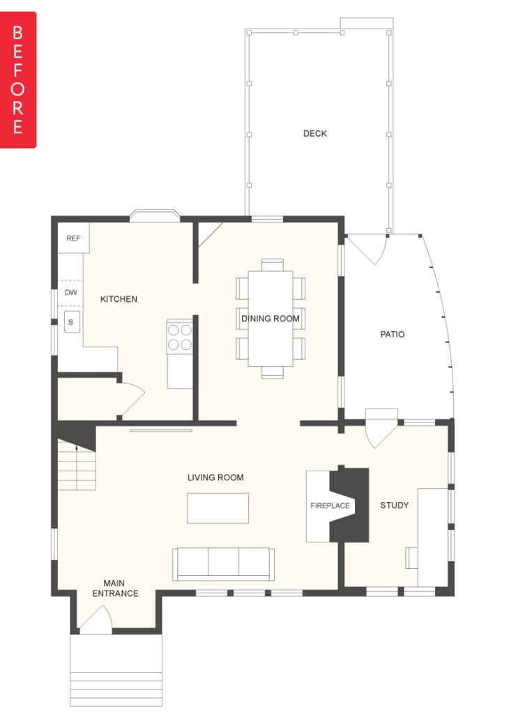 Homeowners Shannon and Scott loved their home, except for one problem: their two-story house didn’t have a bathroom on the first floor. This was particularly annoying and inconvenient for Shannon — at home during the day with their young daughter, she found herself constantly running up and down the stairs. So Scott and Shannon turned to architect Andrew Mikhael, who identified a spot where they could add a bathroom, without adding to the home’s foundation at all. Can you guess where they fit it in?