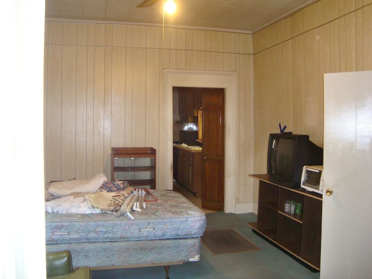 When Tiffany Napper bought this New Orleans shotgun in 2010, she had major work cut out for her. The house – previously owned by a 93-year-old woman who had been born in the house and lived there until she died – had drop ceilings, faux wood paneling, and dirty wall-to-wall carpeting. The narrow 1400-square-foot structure had a small dark kitchen, one tiny bathroom, and four small bedrooms sandwiched together without a hallway.
