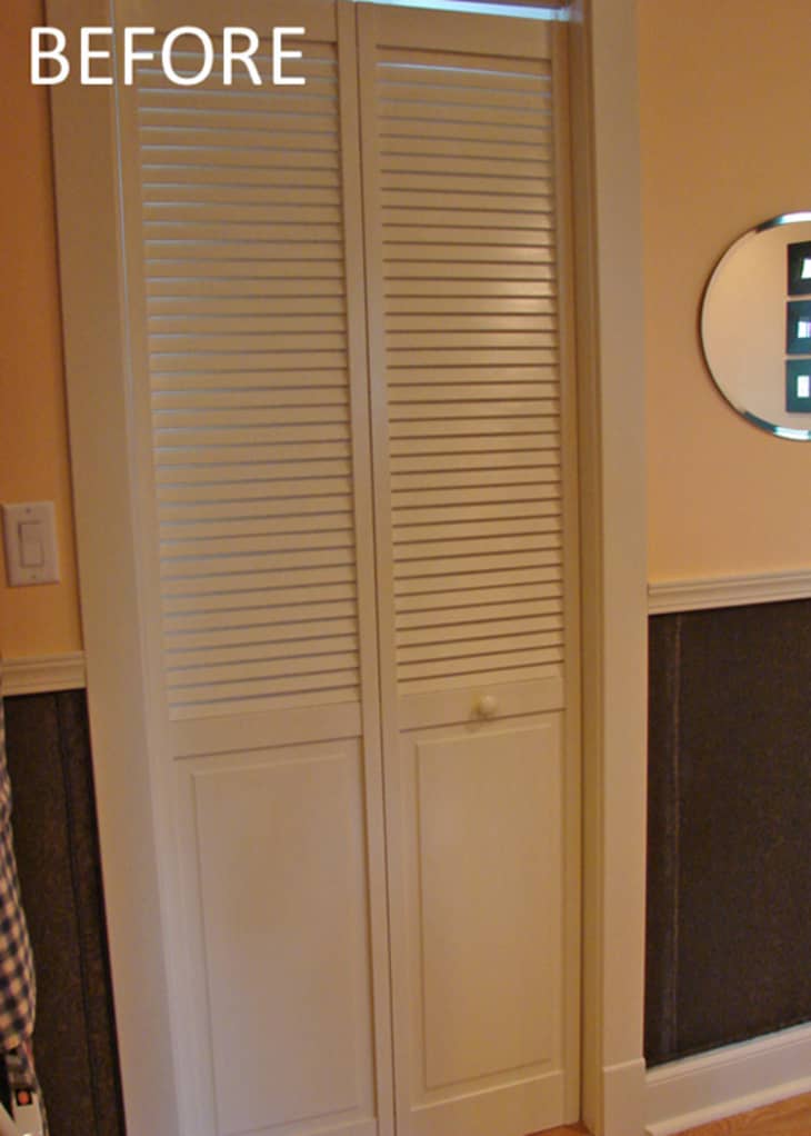 The washer/dryer hookup in our apartment is perfectly located right off the kitchen and close to the dining room, where we do all the laundry folding. Since this is our first apartment with laundry inside the unit, we’re quite happy to have it so centrally located. Although the location of our little laundry closet may be nearly perfect, the presentation leaves a lot to be desired. Those louvered bi-fold doors have got to go!