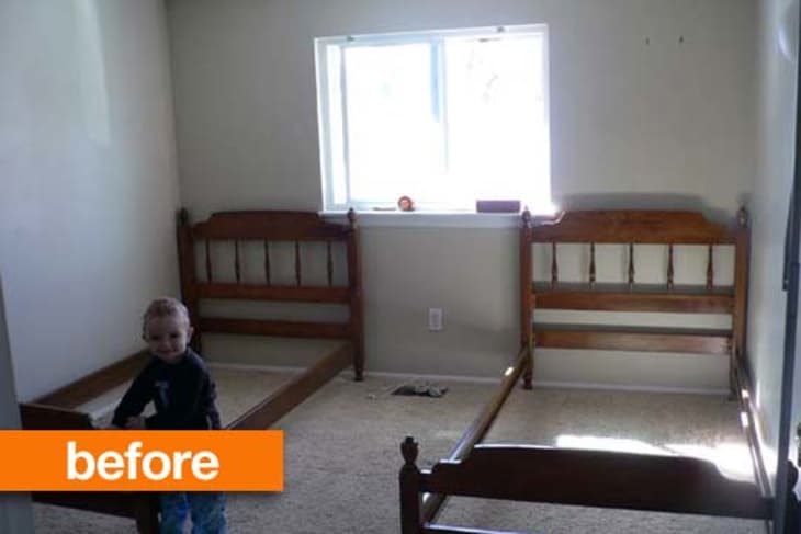 That’s right- the beds are taller in the after picture; 9 inches taller to be exact. The vintage beds were too low to allow for under the bed storage, a central part of Alisha’s plan for the space. She and her husband added 9 inch table legs to the ends of the headboards and footboards to raise them up enough to accommodate storage underneath. The final product is a wonderful big boy room sure to also delight any visiting relatives, at least until that second bed is taken over by Alisha’s baby daughter!