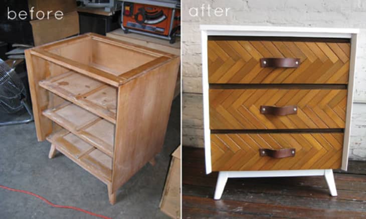 Hello, beautiful, dresser! I have a similar piece on my DIY To Do for the summer, so I was super inspired by the creative addition of herringbone and the piece’s simple white finish: “The dark and light woods, leather and crisp white paint work wonderfully together, and the herringbone pattern is just amazing and apparently quite simple to make,” writes Design*Sponge. Read on for full the project’s full description and instruction.