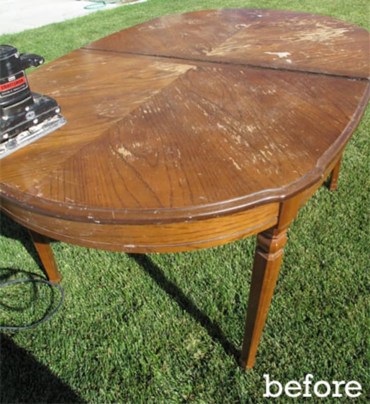 Though this thrift store dining table was missing a leaf and had obviously seen some hard use in the past, the classic lines and solid wood construction were just crying out for a little TLC to become a showpiece in someone’s home. Priced at only $15, this table was a steal despite the problems with the fininsh on the tabletop. Though this makeover does involve some paint, the wood purists among you should also be happy with the final result.