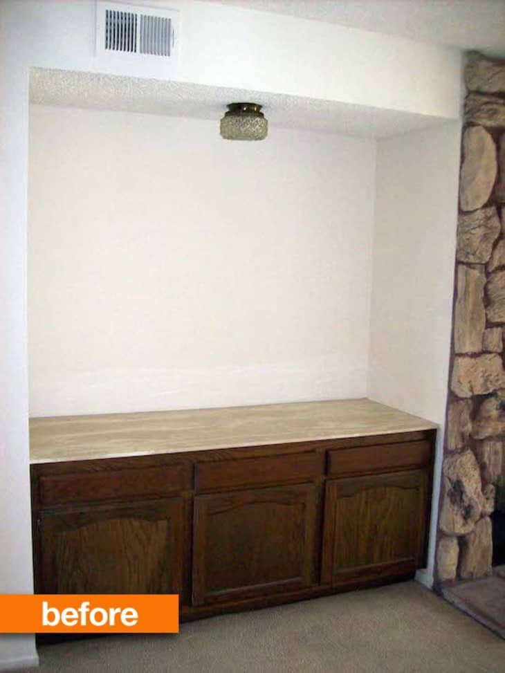 As a writer I have a few too many books and I think built in book cases add so much character to a room. We reused all the cabinet doors and the existing wiring for display lights, he also encased the plastic laminate top in wood rather than going to the trouble to remove it. The end result provides me lots of storage underneath for movies and office supplies, a nice place for me to display some of my favorite books. But most rewarding is seeing my dad take something I drew on notebook paper and transform it into reality.