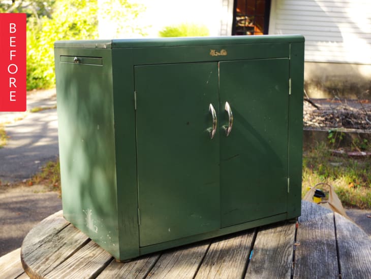 From Naomi: When I salvaged this old cabinet from the nurse’s office of a local school that was about to be demolished, it was gross – dirty, rusty, and covered with some strange gunk. But I knew that the sleek shape and modern chrome handles had potential.