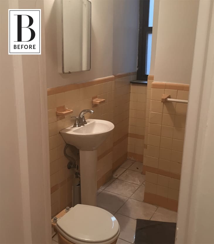 As a connoisseur of all things vintage, I am certainly not immune to the appeal of an old-school peach-tiled bathroom, but this one had seen better days. The tiles were cracked and patched in mismatched colors, the toilet was one of those tankless numbers where you always feel like you’re going to fall over backwards, and the flooring (almost definitely not original) was more gas station bathroom than mid-century dream. Emily, a homeowner new to New York, wanted a clean, bright, and modern update to this small space — one that would feel classic and not cramped.