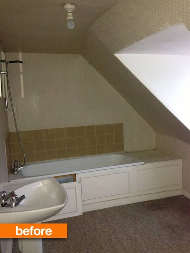 Emily tells us that she, “wanted all evidence of this bathroom removed as fast as possible.” This attic bathroom had everything she didn’t want: thick fluffy carpet, limescale blocked taps and a bowl collecting liquid beneath a ‘critical’ drain. Eww. She smartly thought about how she wanted to feel in this space, and thus came up with a redesign plan for this high-altitude room.