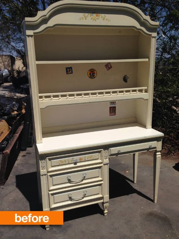 When Tessa found this desk in the free section of Craigslist, she knew it was meant to come home with her. She said, “I liked the lines of it a lot and the non-existent price tag, if not the color and Hannah Montana stickers.”