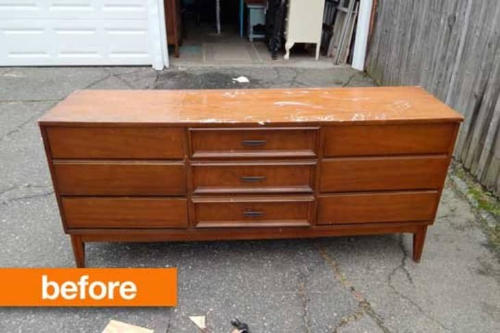 Angela says, “Sometimes you should just walk away from a craigslist sale,” but she must be a glutton for punishment because she still brought home this dilapidated Dixie dresser for just $40. It had chipping veneer, major leg damage and sagging in the center, so we were shocked to see this baby looking so lovely.