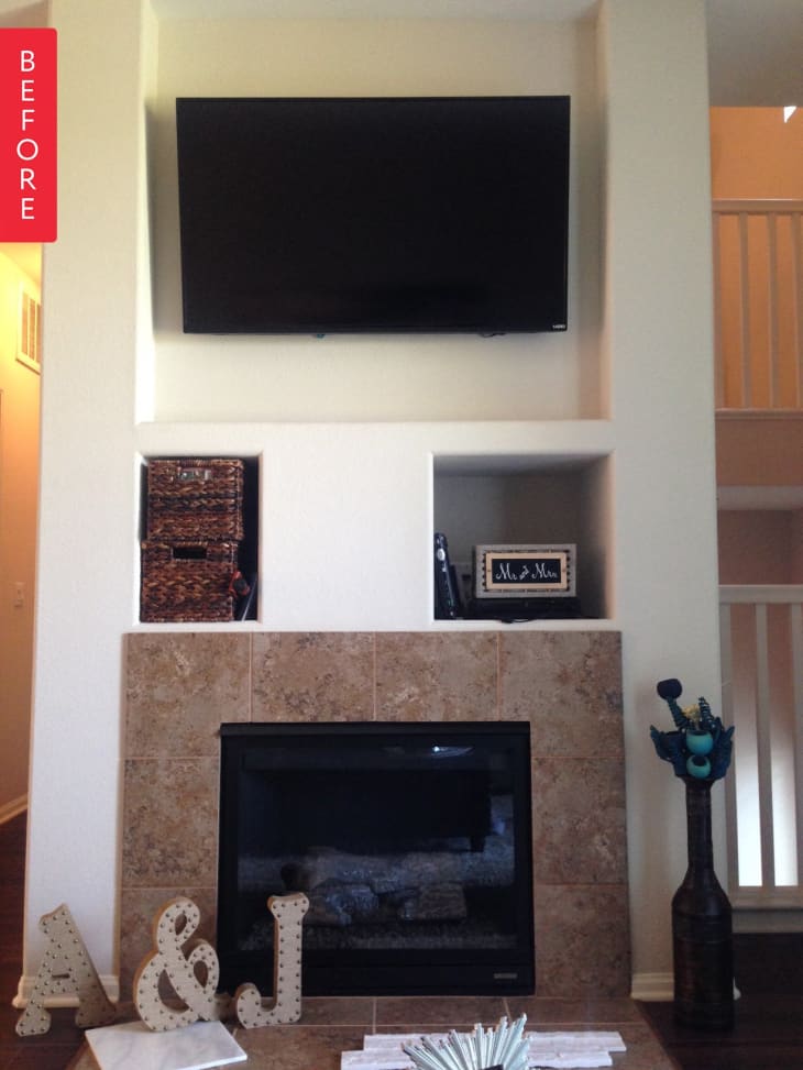 My husband and I recently moved into a brand new townhome in San Diego, California. We absolutely love the new place but for some reason, the builder created really awkward and unevenly sized “designer nooks” above the fireplace. We tried to think of ways to design around them but ultimately we knew we needed to cover the holes up and create a mantle.