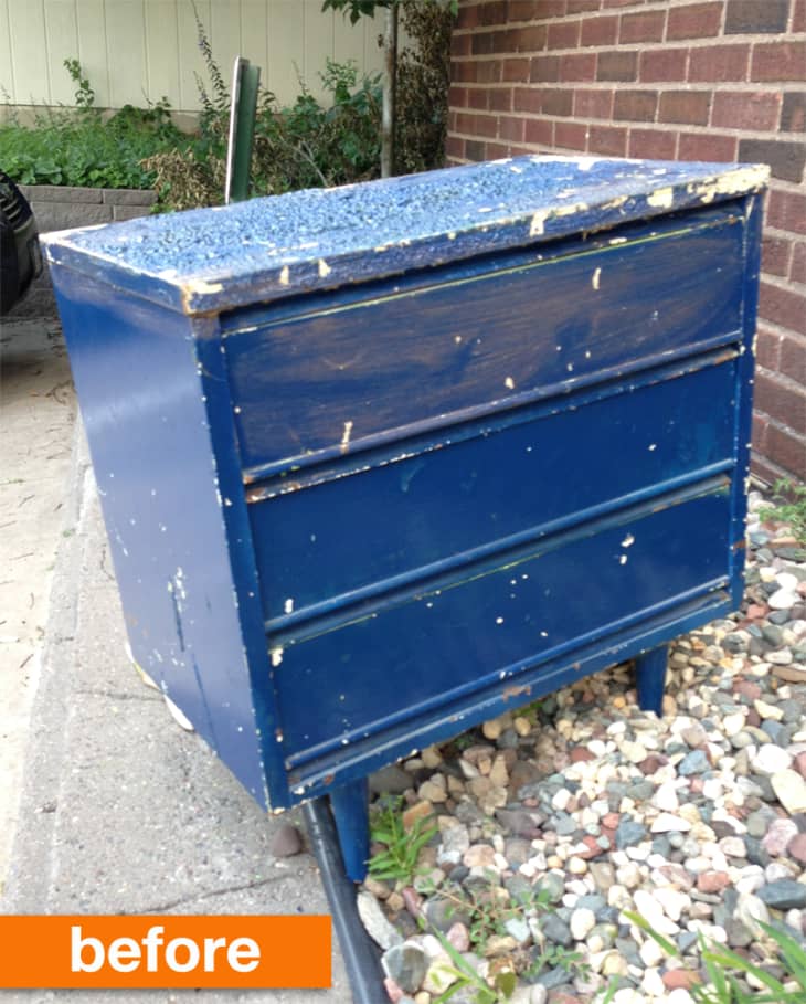 You can see that this bright blue piece of furniture has a nice mid-century shape, but with the thick, gloppy coat of paint, the damage to the top and the overall unpleasant look of the exterior, plenty of folks would probably pass this furniture piece up, even if it was free. Not Zachary. He spotted it, took it home and did one impressive make-under!