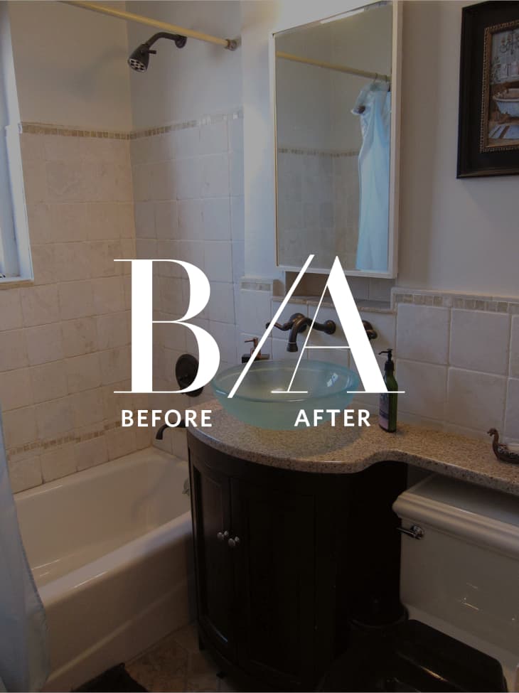 The extra storage allowed them to replace the dark, ponderous sink cabinet (and outdated and hard to clean vessel sink) with a newer, lighter vanity, which takes up less space and also visually enlarges the room.
