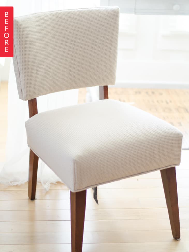 Jill snagged this basic chair for a buck, and decided it could use some style. Instead of reupholstering, however, she made it a custom slipcover instead: