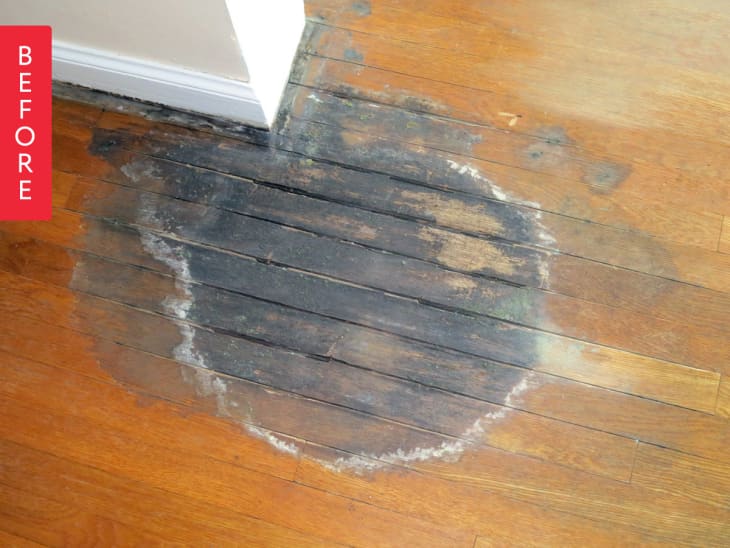 When the carpet was gone, we were astonished by how good the wood looked—glowing and smooth, with a beautiful honeyed patina—except for one spot. Right near the entrance to the kitchen, a previous tenant had apparently over-watered a house plant for years and left a gaping black hole in the wood.