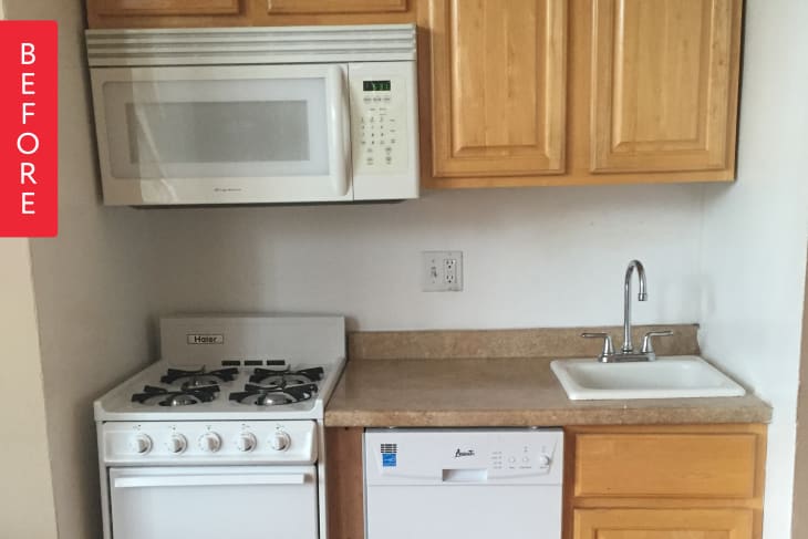 In the hunt for the perfect apartment—one that’s located where you want and doesn’t cost an arm and a leg—you sometimes have to make sacrifices. For Kimberly’s search in Philadelphia, she was willing to settle for a small “kitchen” since she doesn’t cook often. But she wasn’t going to settle on it being boring and beige. Her quick, contemporary makeover of the kitchenette in her new living room is totally cute and affordable—and we’ve got the resources you can buy to use these ideas in your own small kitchen!