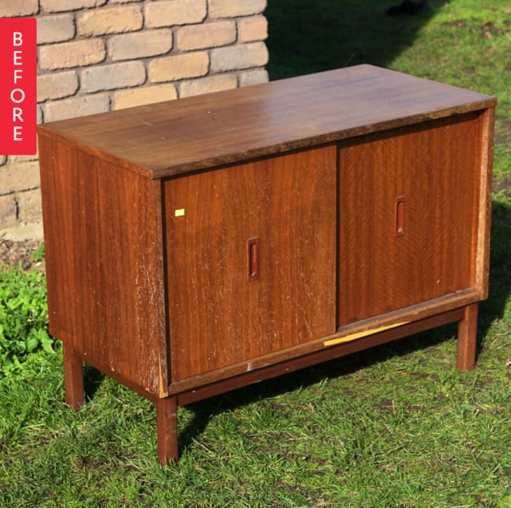 Steph was in the market for a little record cabinet and found this veneered chipboard ‘60s cabinet. The varnish was shot — scratched, faded, and bubbling where it had been left in the rain — and the veneer had chipped off in a couple places. Never fear! Handy Steph worked her magic and performed a wood resuscitation.