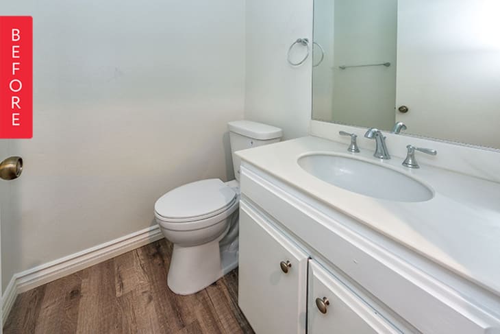 When we moved into this rental house last year, we had the luxury of not only having a powder room but also a newly-painted, all-white space with a beautiful grey wood floor throughout. Although the rest of the house has large windows and skylights and is very bright, this powder room has no windows and is tucked into the end of a short hallway. The white walls in this powder room felt a little clinical and even kind of dingy with just one small sconce providing light (the before photo is from the realtor’s website and was taken with the hallway light on). I turned to paint and accessories for a quick and easy makeover that would add some style to the space. Given that the room is fairly small it also felt like a manageable space to makeover both in terms of labor and cost.