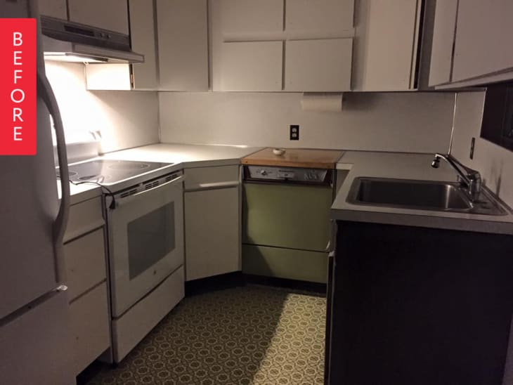 We moved into our house in summer 2011. The house, built in 1944, was in good shape, in a great neighborhood, and priced very competitively. However, aesthetically it was a bit lacking. The previous owners had owned the home for 50+ years, and the most recent updates to the kitchen and main living area had been made in 1974. The kitchen’s closed-off ’40s footprint was left intact, but they swapped in ’70s dark cabinetry, gold-veined laminate countertops, avocado appliances, and fluorescent lighting for good measure. We painted the cabinets to get us through until we could afford to remodel, which ended up being over four years later.