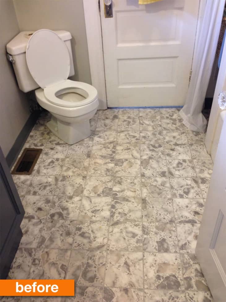 Before & After: Alexa’s Affordable Stenciled Vinyl Bathroom Floor Makeover
