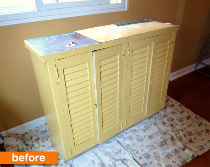 For months, I’d been dreaming of erecting a formal structure to contain all this ugliness. Then I stumbled upon this messed up little cabinet in the alley two blocks from our apartment. It was the perfect size for our kitchen nook, and could snugly hold two small trash bins. And like all great treasures from the alley, it was ugly, but solid.