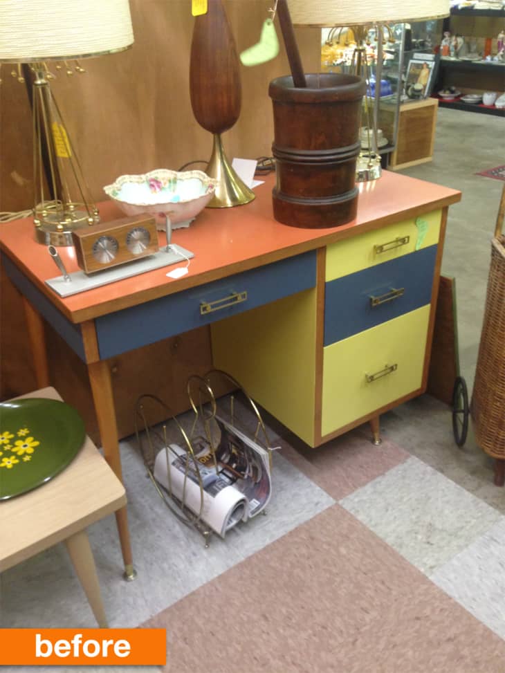 Featuring a color palette of pale yellow, navy blue and salmon, this desk was a mess of colors. Many people not on the hunt for such a mix of hues would probably have taken one glance and moved on. But Brittney saw past the palette to this desk’s beautiful bones, and set out to restore it back to its mid-century modern glory.