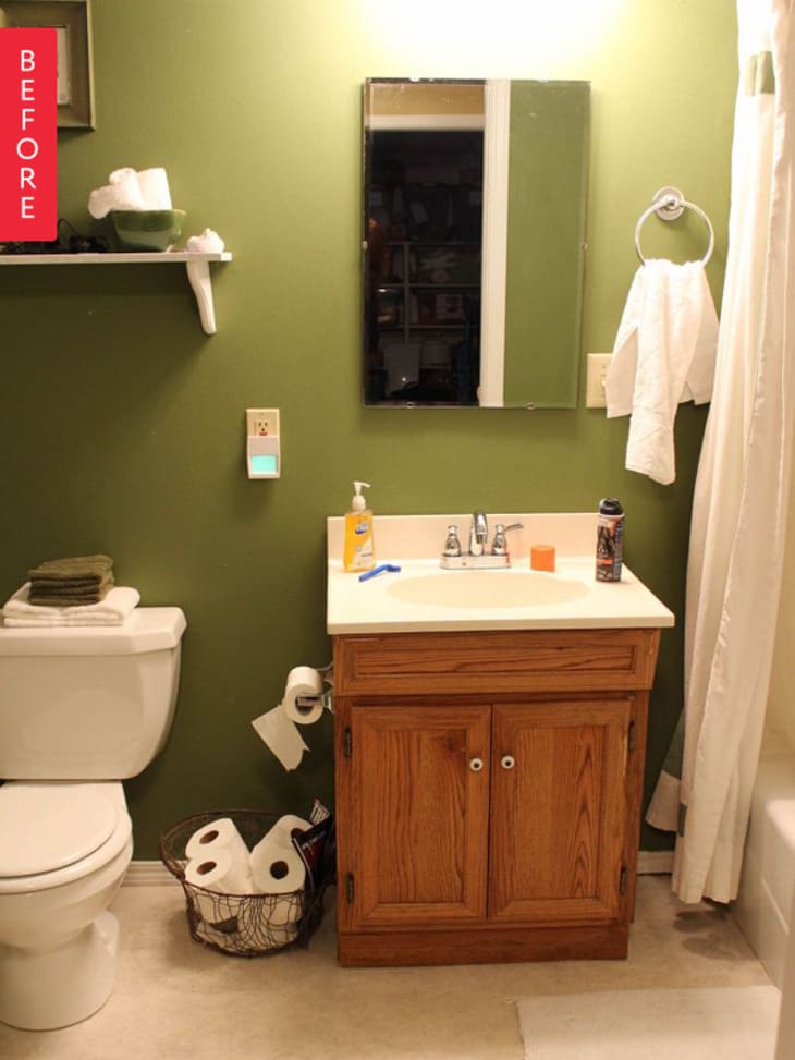 Carrie’s small bathroom was lacking style, with a basic vanity and overpoweringly avocado walls. For little more than $100, she brightened the space with a farmhouse twist: