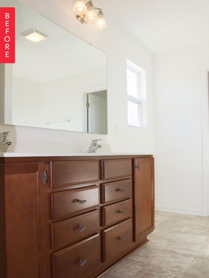 Lauren and her husband spent their home budget on upgrading the things they couldn’t DIY. So after they moved in, they went to work on personalizing the builder basic areas, like this bathroom—for under $400.