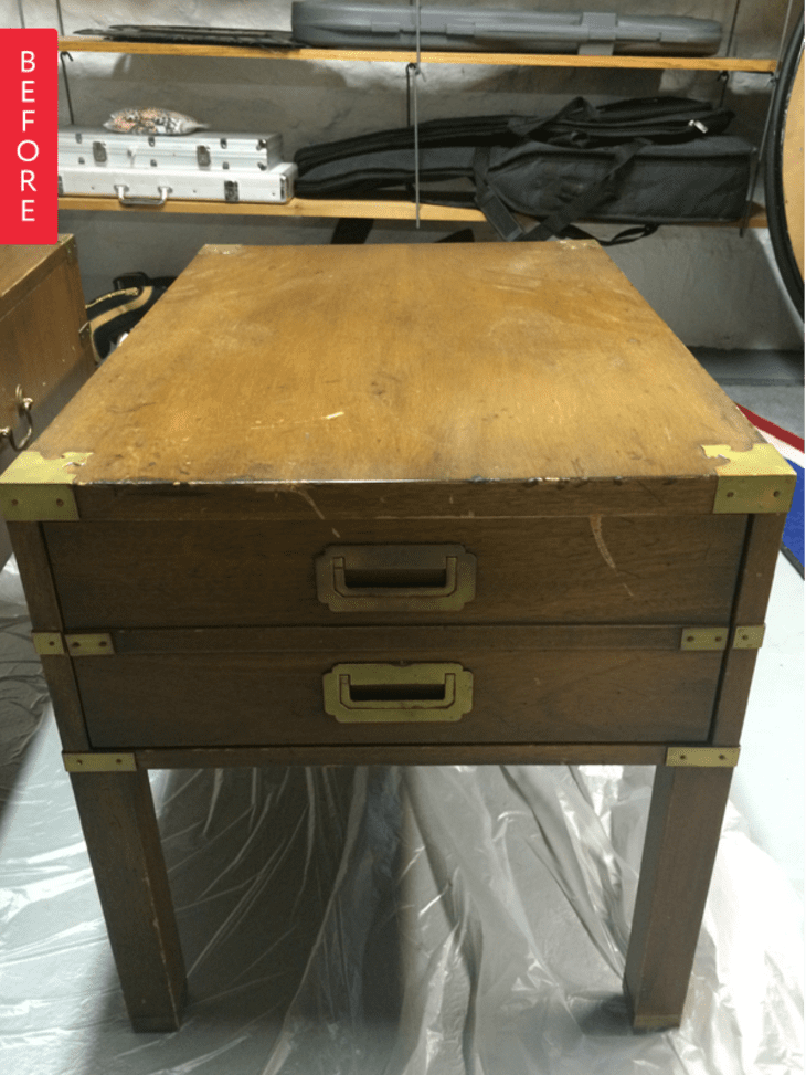 Claire scored a deal on a pair of campaign nightstands, that, despite the brass being in good shape, could use some refinishing. She didn’t really need the bedroom storage, so she put them to use in the living room: