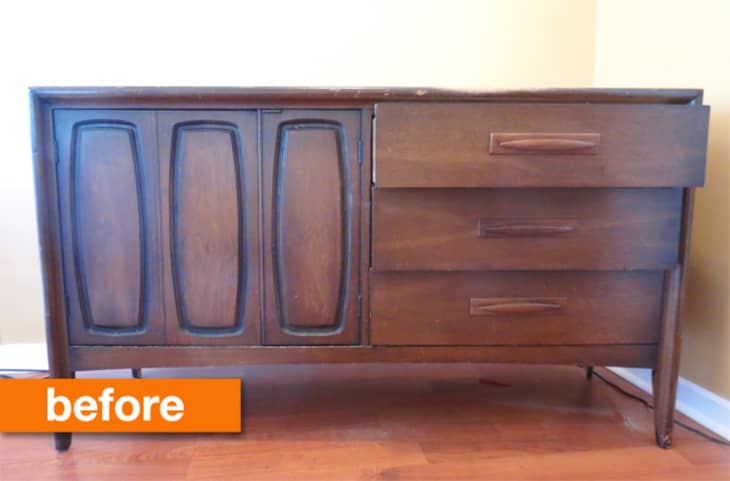 Claire found this credenza with tons of potential on Craigslist for only $30. But, though the lines were beautiful, the shape nice and the extra storage space it would provide a bonus, the finish was banged up and the color didn’t fit with her tastes.