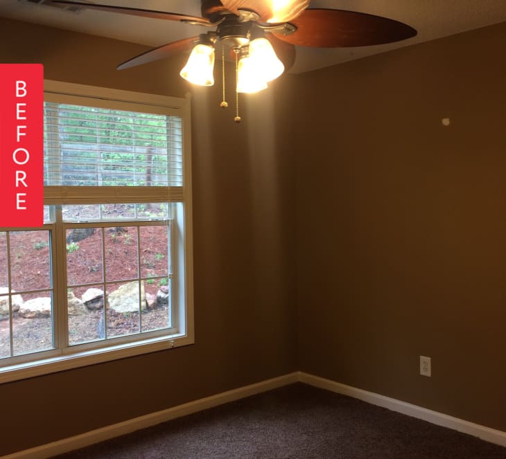 From Sarah: A few months ago we bought a new house and immediately set our eyes on a nursery makeover. The room was originally painted a dark tan, which made the space feel drastically smaller and more dated than it was. The ceiling fan was way oversized for the space and the lights were directly in front of your face.