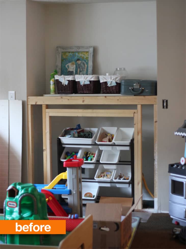Anna Hansen had a prepped and framed nook in her kids’ playroom for a gas fireplace. But a gas fireplace isn’t exactly the most kid-friendly feature, so Anna decided to repurpose the space. For a while, the frame held a toy rack, until she got inspired and motivated and turned it into a fantastic indoor playhouse.