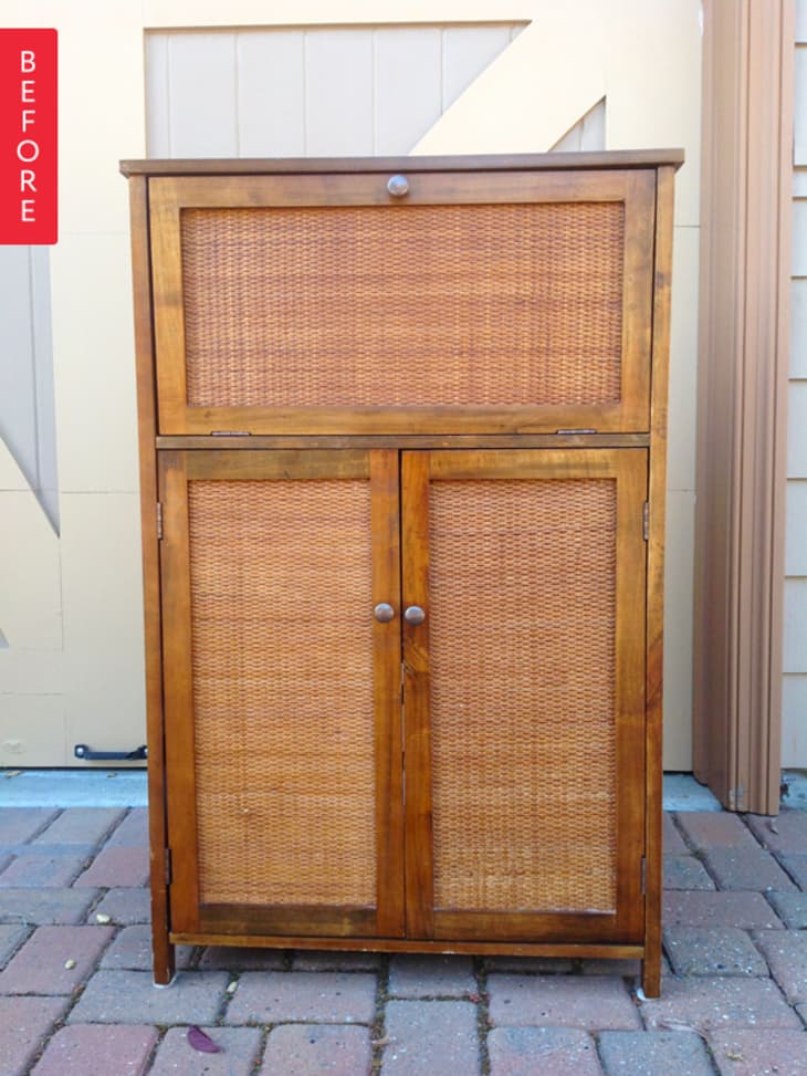Seduced by the siren song of free, Angelica scooped up this cabinet—as the panels started falling off. Not to be deterred, she took some fabric remnants and transformed it into a versatile piece: