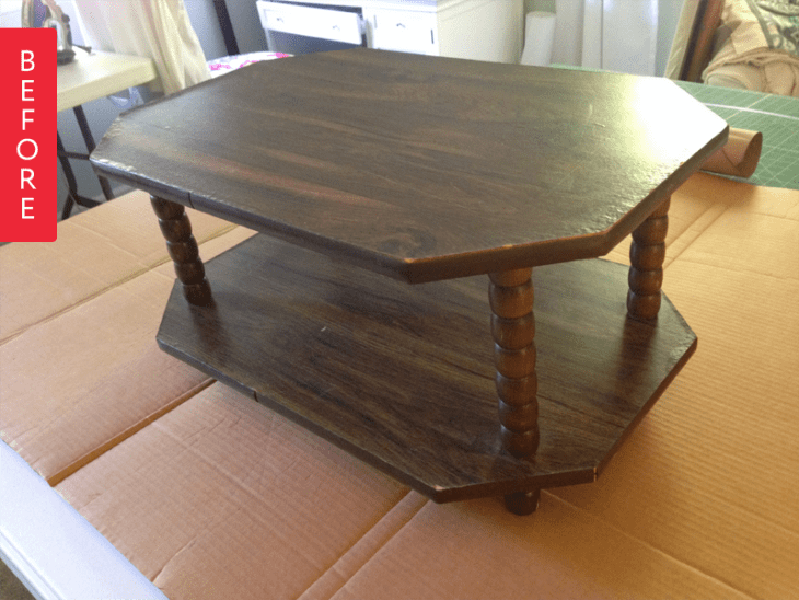 I came across this sad little cocktail table made from cheap blistered laminate in a second hand store. Its only redeeming quality was the octagonal shape, which I thought would make for a cool little ottoman.