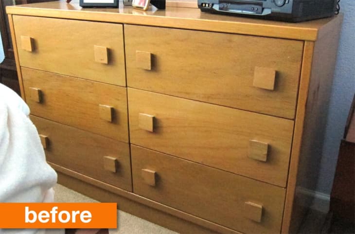 This heavy dresser found on Craigslist was sturdy, and Allison loved the clean lines and large, square drawer pulls. But she was not a fan of the yellow-ish finish (which she claims looked even worse in person). She hatched a plan to give this dresser a more modern, stylish look.