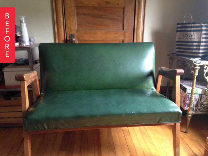 I bought this piece on Craigslist for 45 bucks. I ripped off all the old naugahyde upholstery and found sub-grade wood underneath. I filled all the upholstery holes with wood filler and painted that black. I re-stapled on black polypropylene webbing and refinished the base of the chair and I love this bench/loveseat now! Because I have 4 coats of poly on the wood, I think I’m going to use this chair outdoors on my patio!Thank you Zachary!