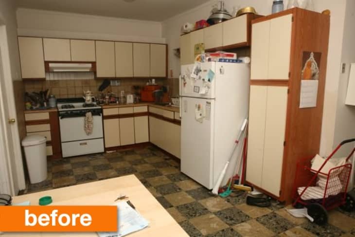 Rebecca’s landlord graciously upgraded the “dismal” linoleum floor when she moved into this rental apartment in Astoria, Queens. But the cabinets — the kind of cheap, beige particleboard cabinets you find in dated apartments — were in serious need of something to make them more attractive. On a tight budget, Rebecca turned to paint and a cheery color palette.
