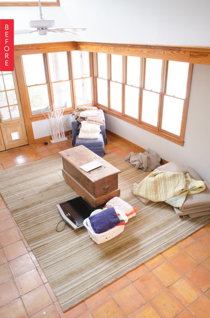 I had the pleasure of re-imagining the living space in this pool house, a long room that includes a kitchenette. As you can see in the before picture, the floor is terracotta tile (it was built in the 80s), walls are an off-white, and there’s lots of wood trim. But the great thing about the room is the light – it has a dutch gable roof (glass on either end) and lots of windows! I wanted to brighten the space’s color palette and create a comfortable multipurpose room that accommodated both sitting and dining. I incorporated a mix of elements that added a little bit of the unexpected (like pairing West Elm chairs with a Ballard Designs banquette), while keeping it casual and wet-swimsuit-friendly. With a mix of blues and pops of orange, the end result balanced the warm terracotta tiles while bringing in even more color. It was so exciting to see the space come alive with the mix of furniture and decor, and the finished space feels like a casual summer retreat with a dash of Palm Beach chic!For more about this project, check out Thou Swell.