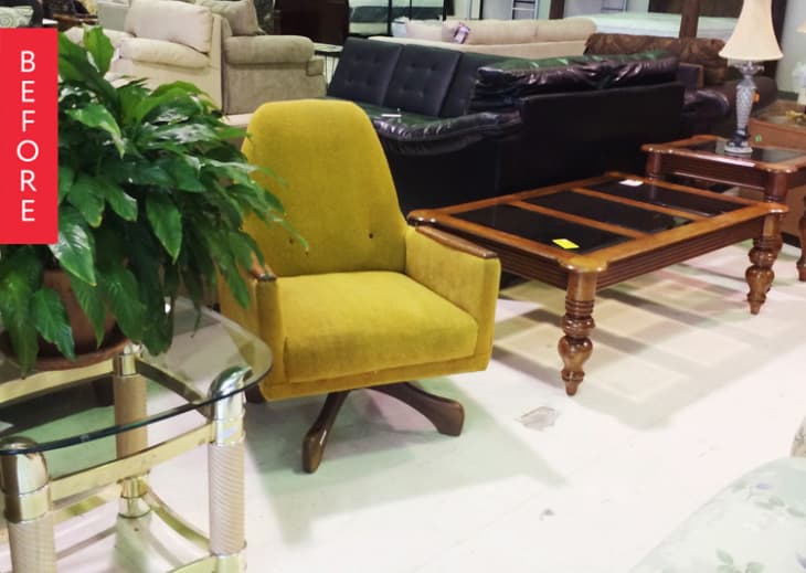Here’s the one I found for my baby girl’s room. It was a vintage yellow beauty in a sea of more current used furniture. I liked the yellow, but the fabric had some stains and wear, so I decided to have it reupholstered. In addition, the wood arms needed some polishing up, so we handled that too. Also, what is the two-button thing about?