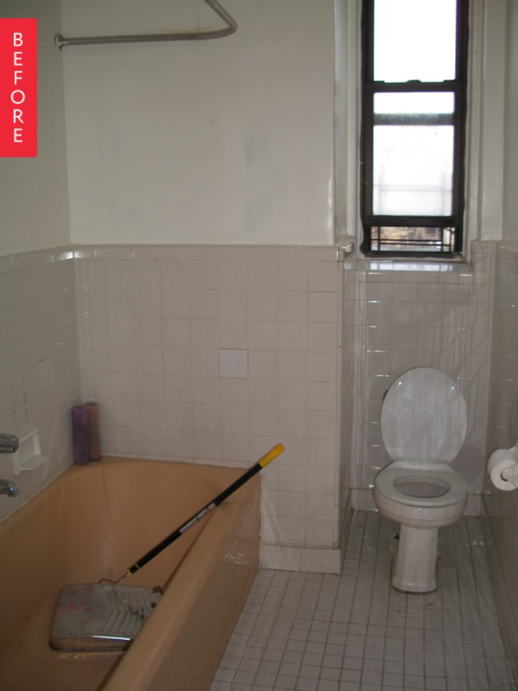 Cori’s apartment had a peach tub and separate tiny shower stall. Since the bathroom already had a small footprint, her contractor combined the shower and created much needed storage space: