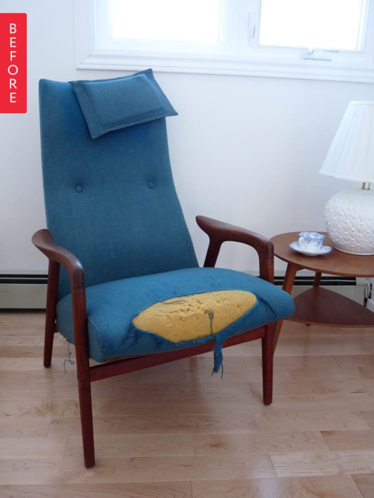 I wanted it so much, I didn’t even haggle (she was asking $250). I saved up, and then spent $400 on a professional upholstery job. Years later, this is still a favorite chair. It’s lived all over my house: guest room, master bedroom, and now the living room. Since having it recovered, I’ve been on the search for a mate for it (pairs of chairs seem to elude me). I recently found out that this chair is designed by Yngbe Ekstrom, and made in Sweden in the late 1950s. It’s called the Mingo. I certainly feel better about spending the money to have it professionally recovered, but now I realize I’ll probably never find a mate for it.