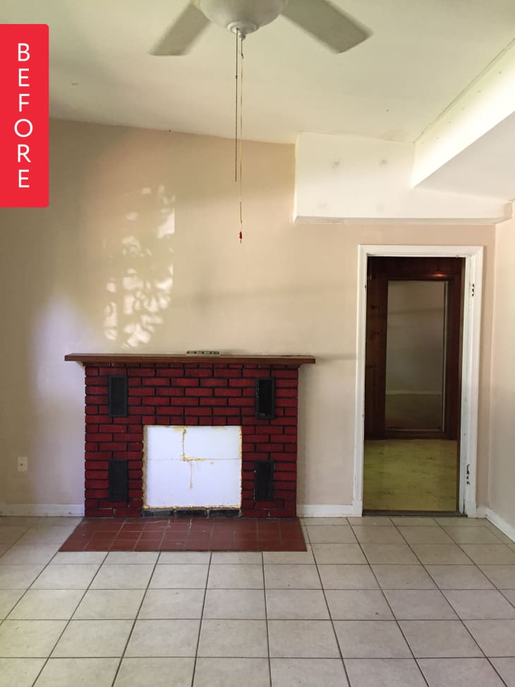 “The fireplace was real brick, but at some point had simply been painted “brick red” and closed haphazardly with foam. To top it off, they kindly placed an amateur painting of burning logs in front. The vents were “sealed” with foil that was painted over and the previous mantle entombed countless dead critters. We painted over the faux brick red color, added custom wood screens over the vents, and generally cleaned up the inside of the fireplace.”