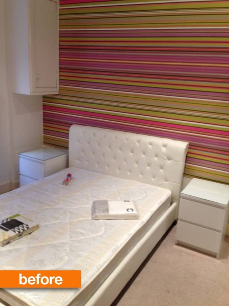 Nadia loved everything about her new rental except for the very…err.. loud wallpaper in the bedroom so she came up with a temporary DIY way to style it to her taste. Heads up, renters, you can so copy this one.