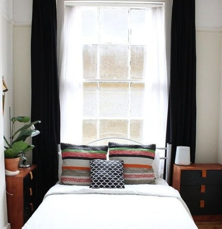 4. This is less a makeover and more of a reveal, but I like the transformation of this room because the result is not what you would expect from a space with a black wall. Astral started with a black wall and then layered the other pieces in: white and neutral gold colors for the furniture, and then mustard yellow and fuchsia statement pieces. All of it works together to create a fun and cozy bedroom.