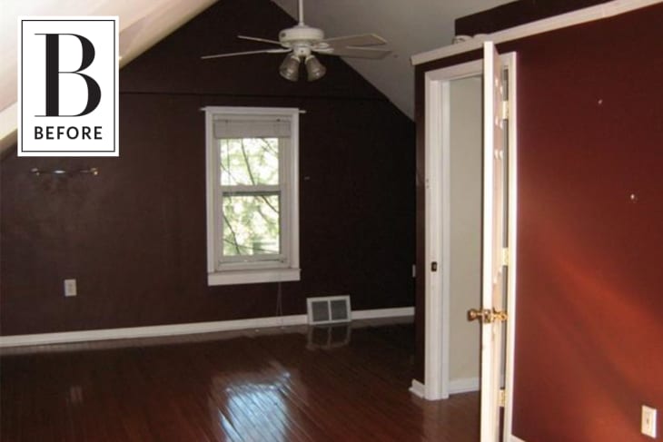 Each room in Meg and Joe’s house was tackled. The bedroom got a clean coat of white paint (Behr’s Ultra Pure White) to cover the dark paint that was already there. Just that small action alone helped make the master bedroom look larger.