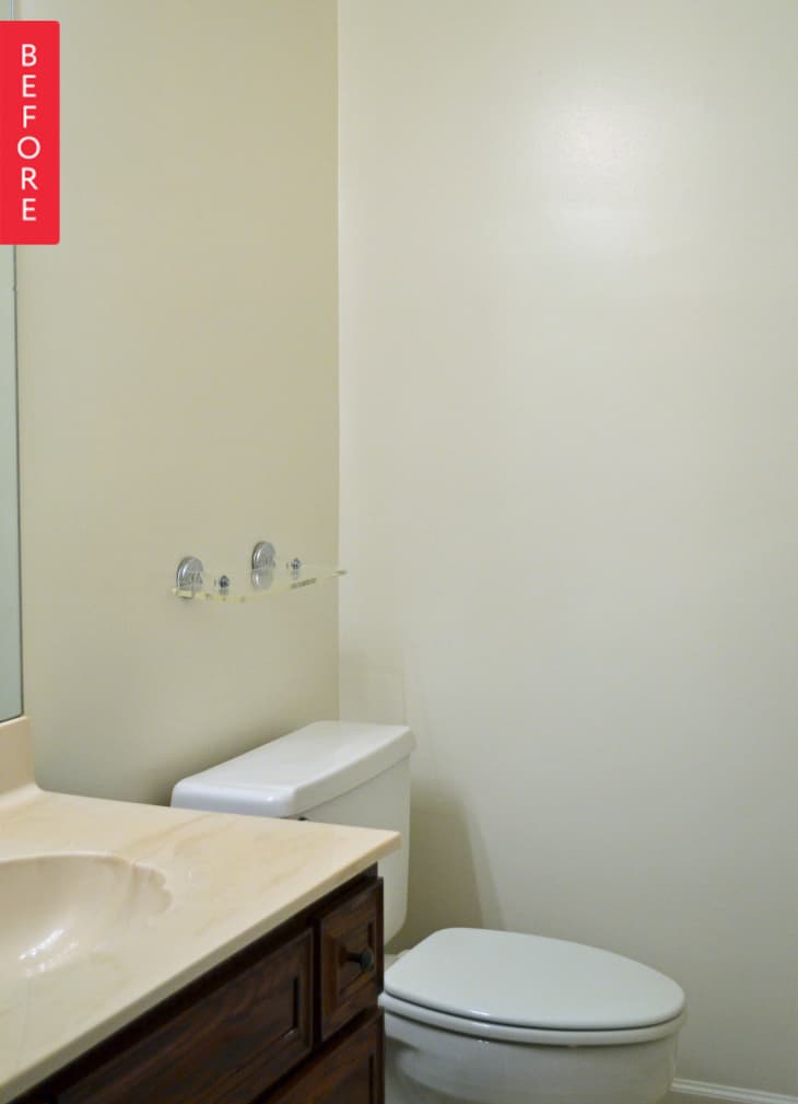From Sarah: Last spring we moved from Manhattan to Northern Virginia, where we’ve been living in a beautiful rental house. I’ve had my eye on sprucing up the powder room in our rental from day one, so I knew this 6 week challenge would be the now-or-never time to do it, as our lease expires in 6 months and we’ve already started searching for a new home. As per our current lease, however, the restrictions for this makeover were major: