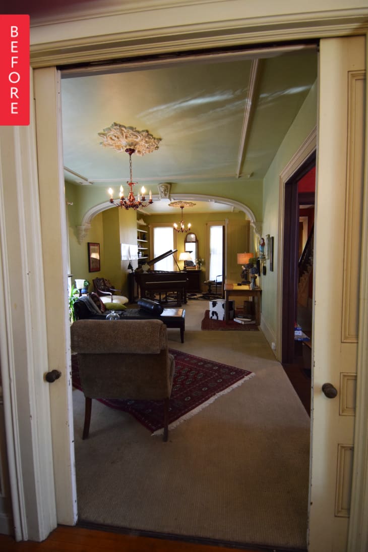 The living room was covered in an ancient dingy carpet and painted a dull green color. It didn’t quite do this room justice and I knew a couple fixes would completely transform this room.