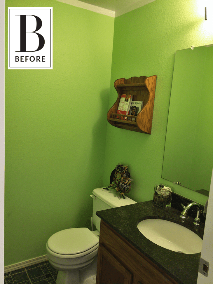 That sure is some green, isn’t it? Anna, of Interiors by Popov, wanted to bring her client’s very verdant powder room into modern times with a sleek and sophisticated upgrade. She upgraded the room from top to bottom, without a hint of green.