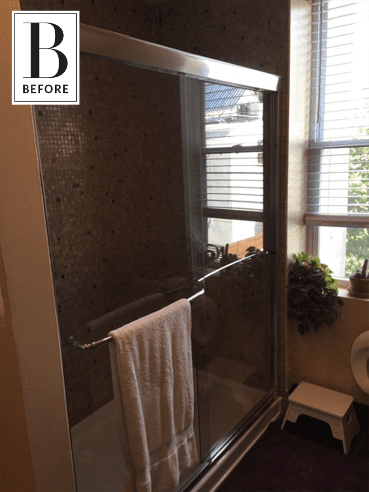 The bathroom closet is enclosed by a grey bifold closet door with custom stenciling. Ultimately, my clients could not have been more pleased with the transformation of this small space.