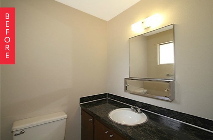 From Ashley: The tiny half bathroom connected to the master bedroom was original to the 1972 house and in desperate need of an update. Its 5’x5′ footprint didn’t offer a a lot of room to work with, but I was determined to add some serious style.