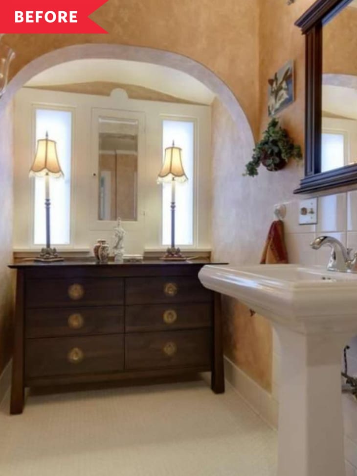 To spruce it up and make it more reflective of her style, she immediately painted the walls, added a Schoolhouse light fixture, a new mirror, and a new faucet. The previous owners had left a dresser in the room (right under the arch), so Gerlach painted that and added fresh hardware, too.