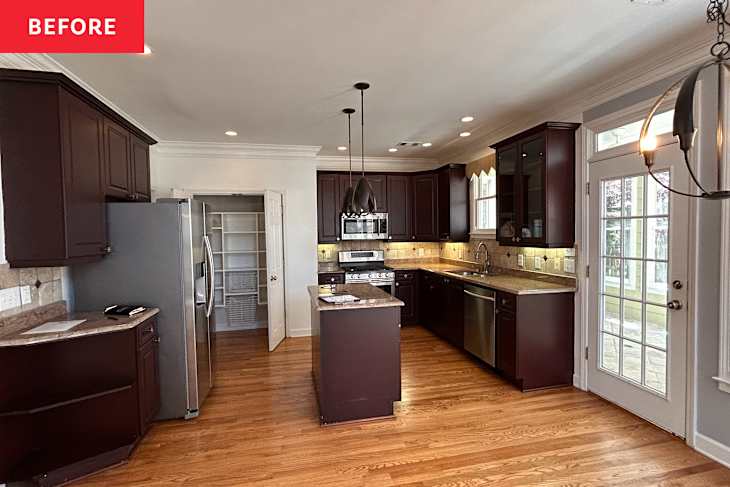When they entered the kitchen, the cook space felt dated, dark, and not optimized for cooking or gathering. “There was no pantry or storage space anywhere to put everyday [essentials],” McGhee adds. “The island was too narrow for the homeowner, who loves to cook.”